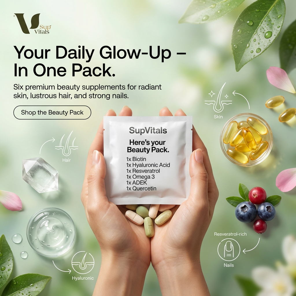 Six premium beauty supplements, one convenient daily pack. Beauty Pack gives your skin, hair, and nails everything they need to thrive from within.